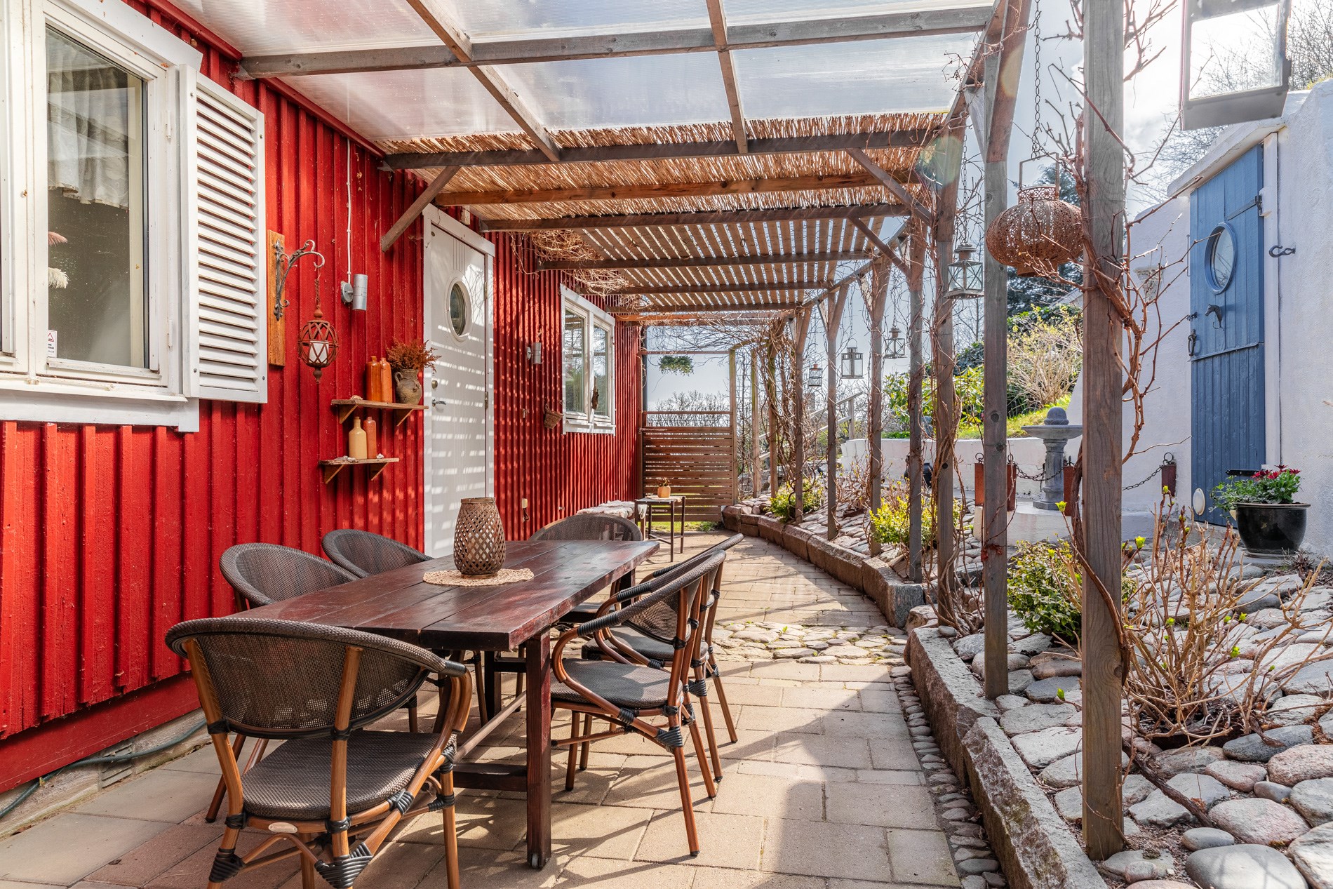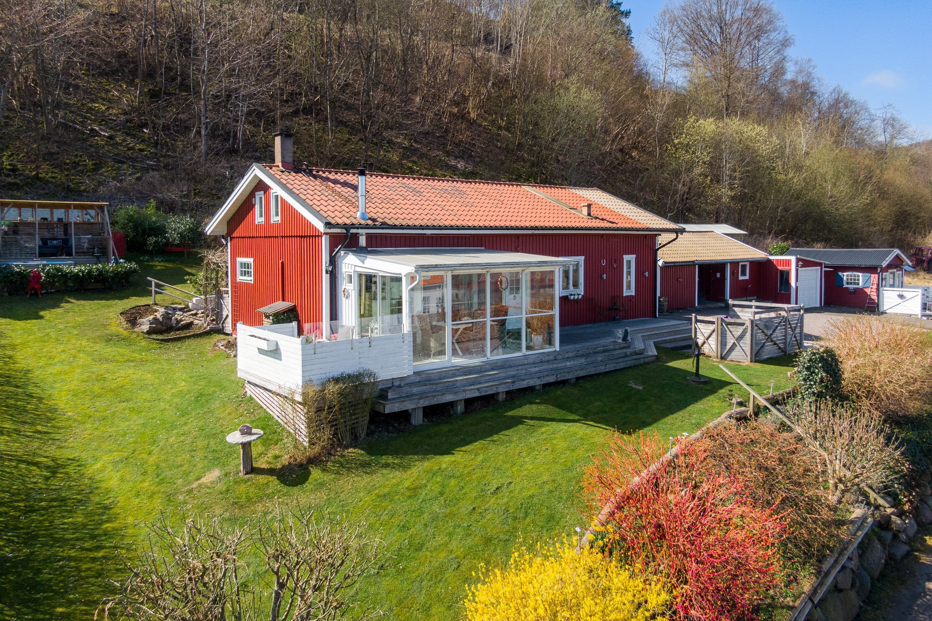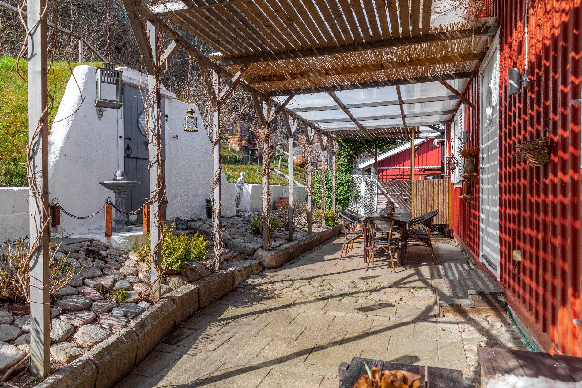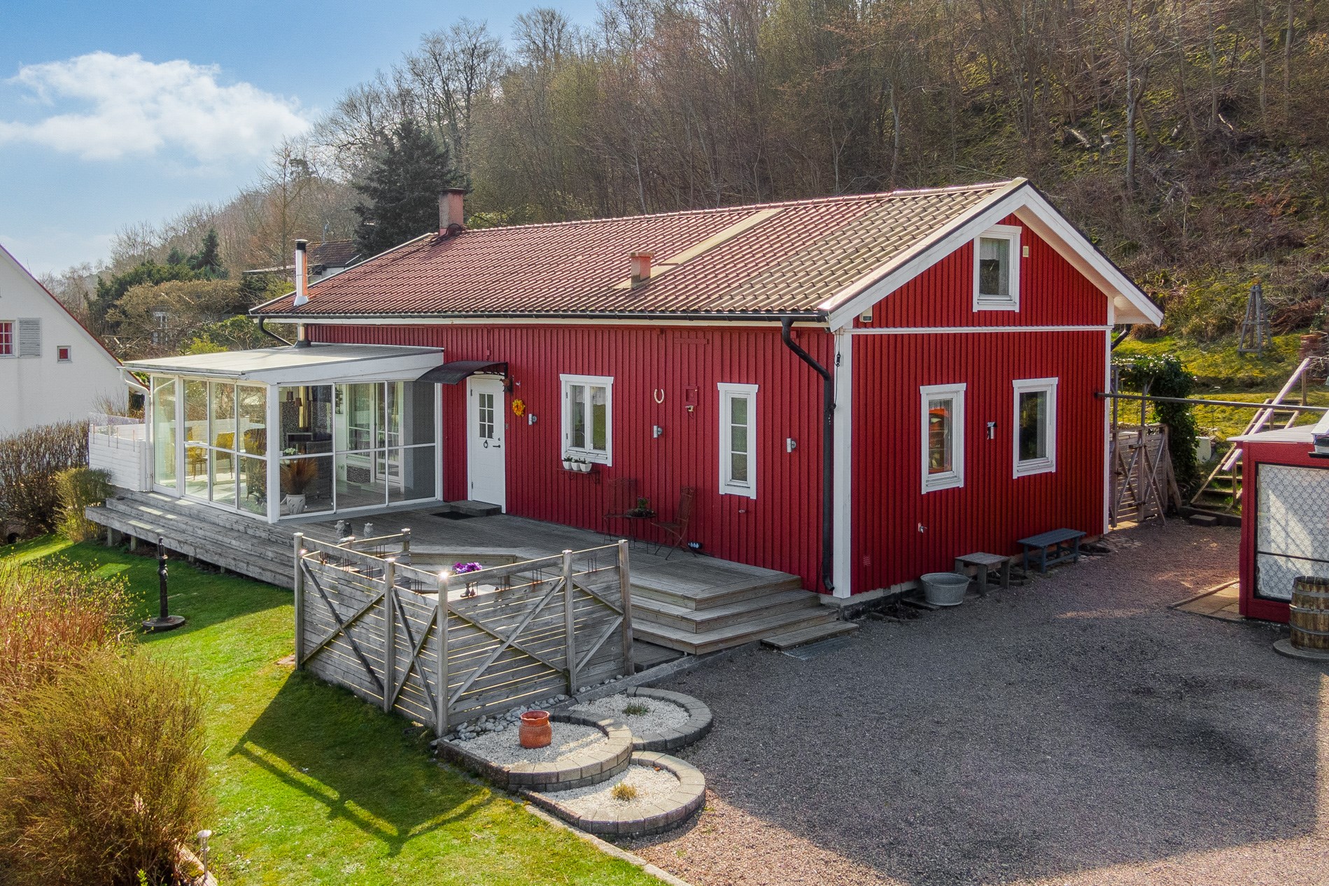 Byggnadstyp1 ½ planByggnadsår1929 (Byggt på 50-talet, flyttat 1996)FasadTräStommeTräFönster2 och 3-glasBjälklagTräTakPlåtGrundKrypgrundUppvärmningLuft-/luftvärmepump, braskamin, el-radiatorerVatten/avloppEnskilt vatten (del av vattenkälla), Enskilt avlopp (1996).VentilationSjälvdragTomtenVacker trädgårdstomt med lummig växtlighet och flertalet uteplatser. Härliga vyer över hav och land.UteplatsTrädgården är full av mysiga uteplatser för att kunna njuta av sol och havsutsikt hela dagen. Härliga trädäck, stensatt uteplats med pergola samt "Afrikanska hörnan" med vedeldad badtunna och loungedel under tak.BilplatsGarage och carport samt gott om uppställningsplatser på gårdsplanen.Övriga utrymmen- Gästhus utrustat med kök, badrum, sällskapsrum och egen veranda med havsutsikt. Ca. 20 kvm. - Garagebyggnad med garage, carport och förrådsutrymmen. - Trädgårdsskjul - Förrådslänga - Växthus - BastuTV- och internetanslutning