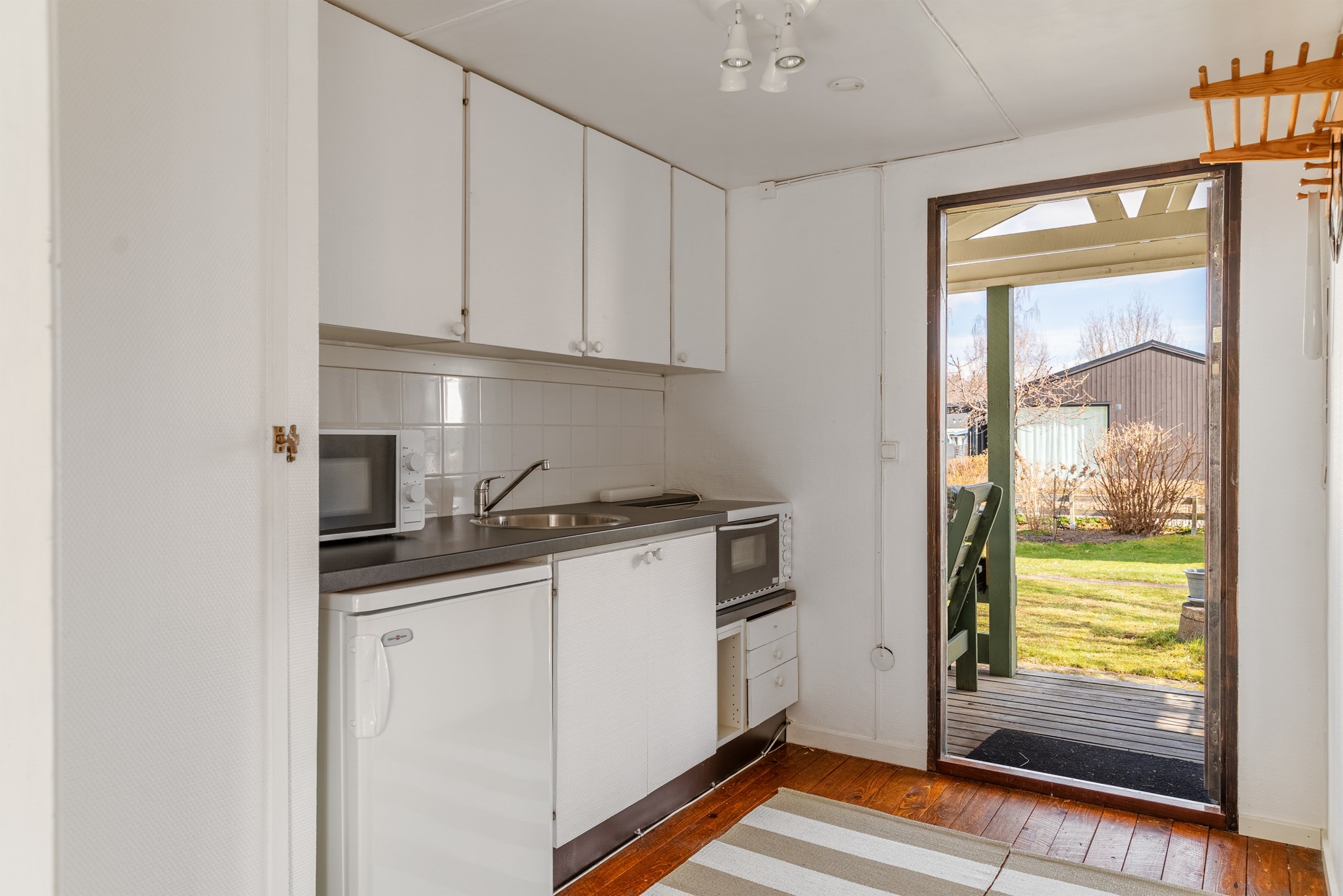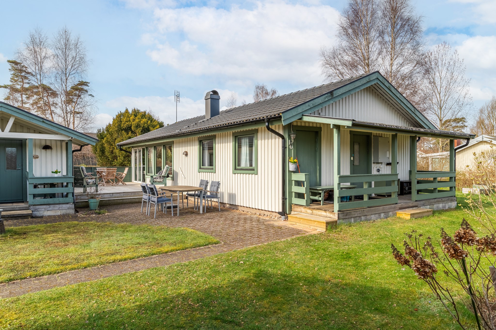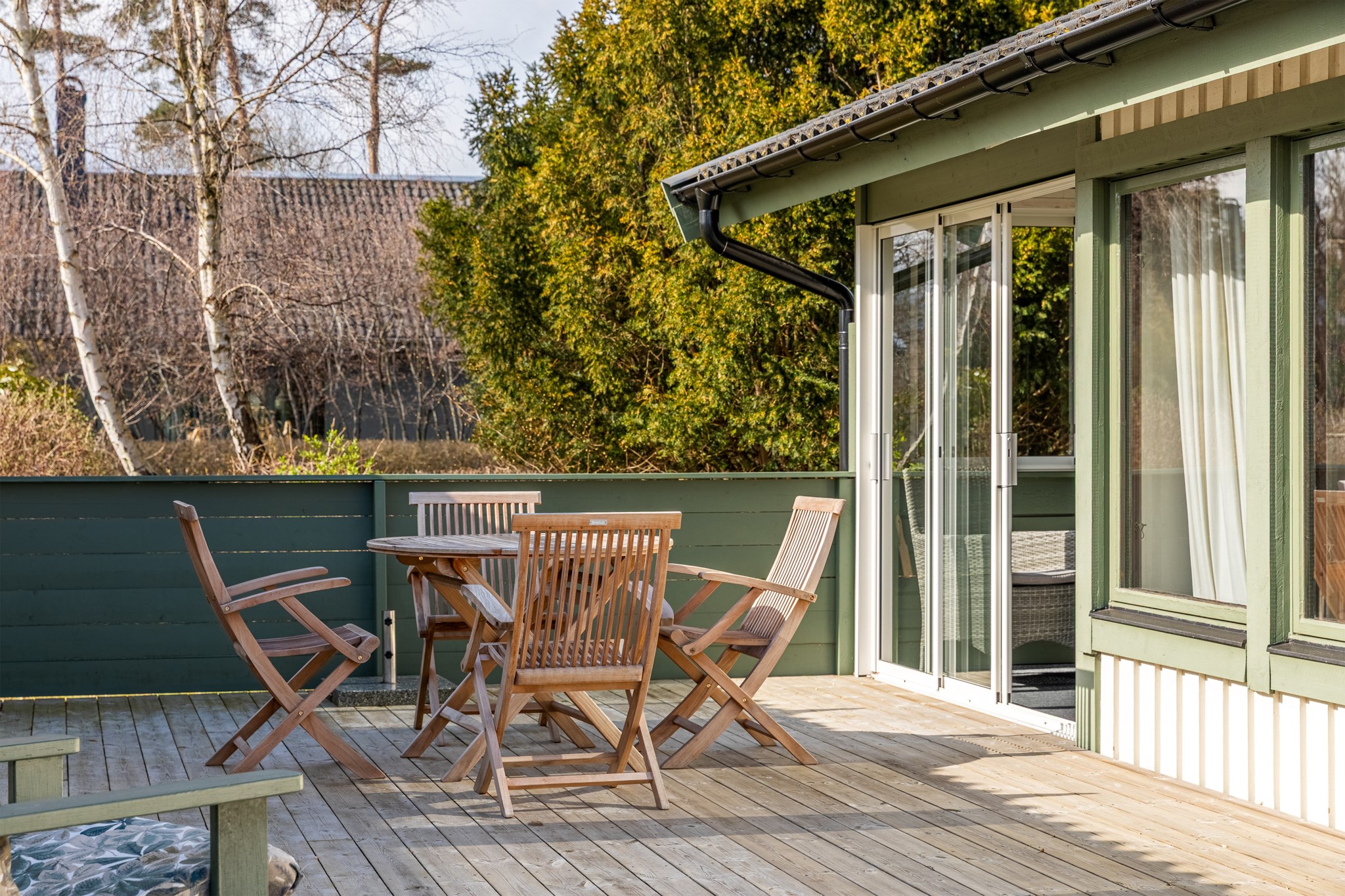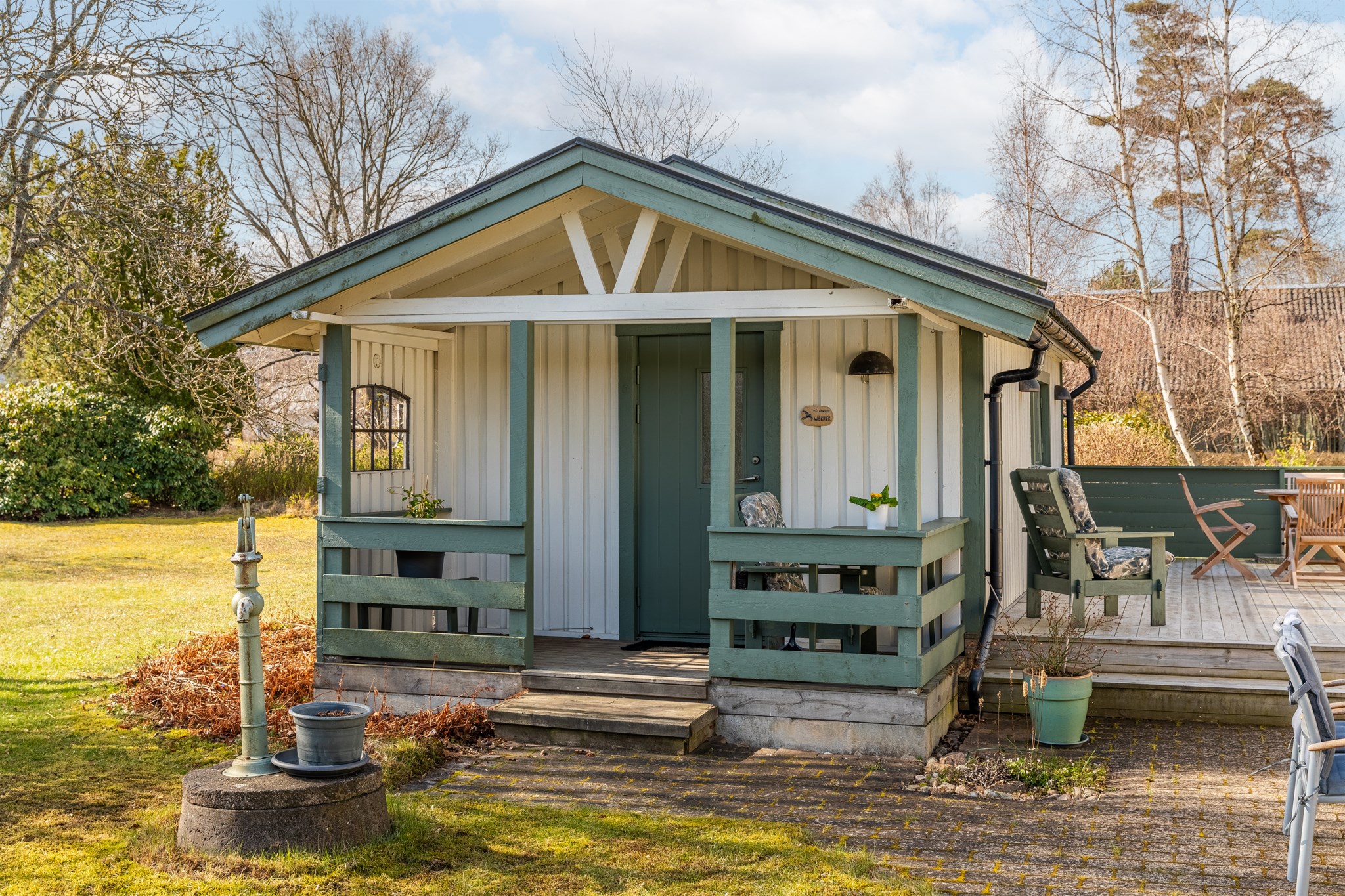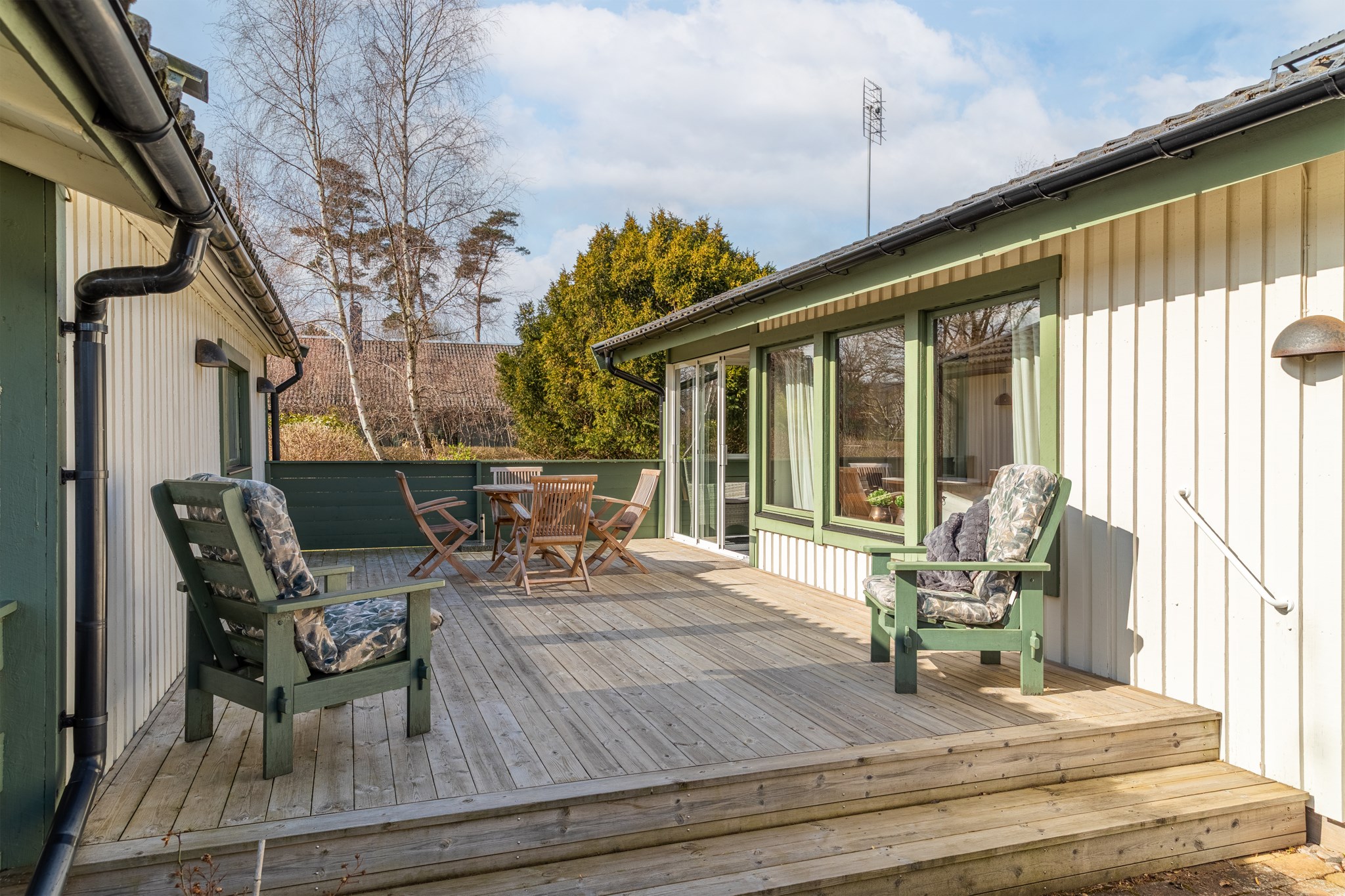 Solbadande altan, vackert placerad mellan boningshus och gästhus.