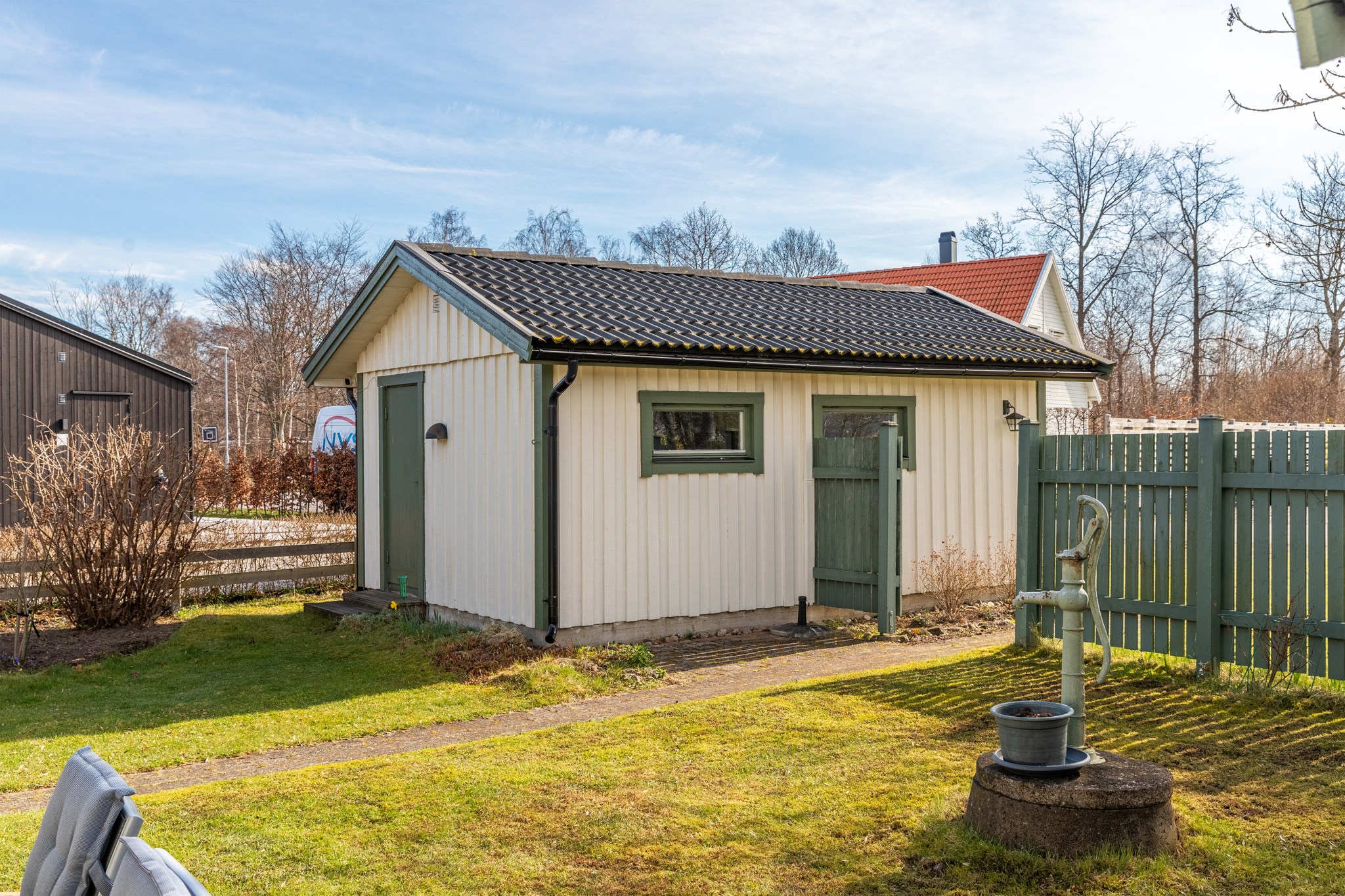 Kommunalt vatten året om. Kommunalt avlopp. Egen brunn finns för bevattning, pump saknas.