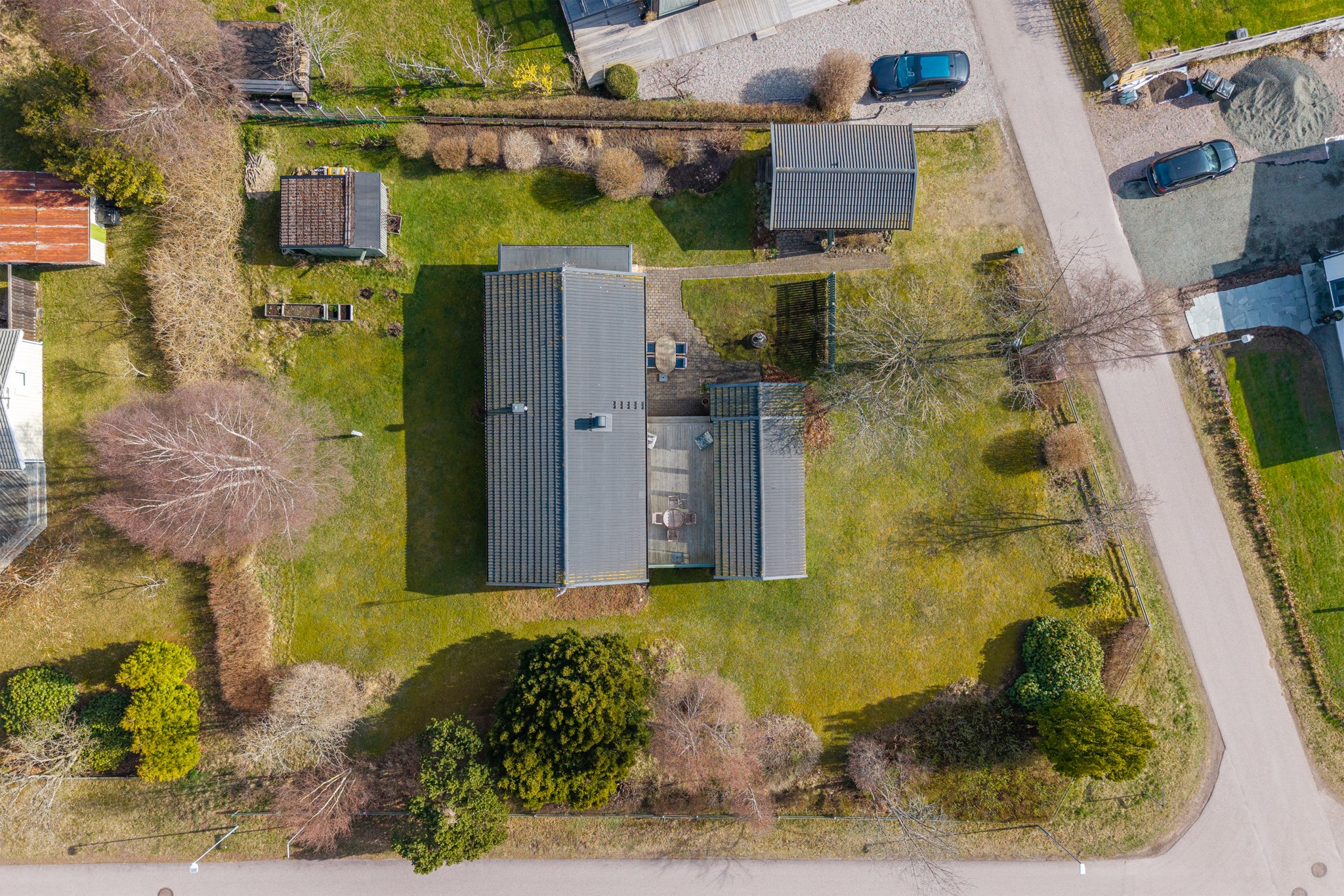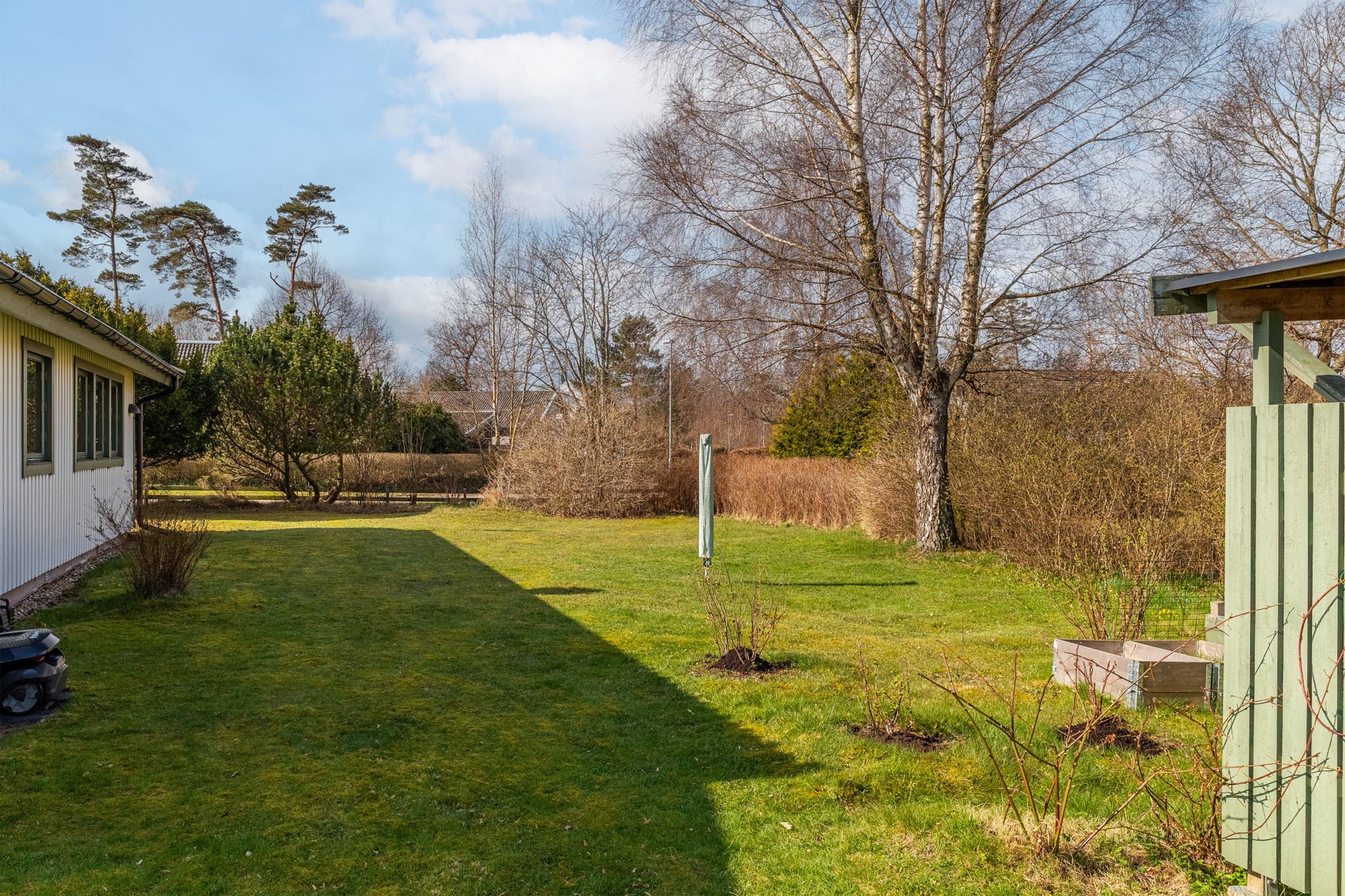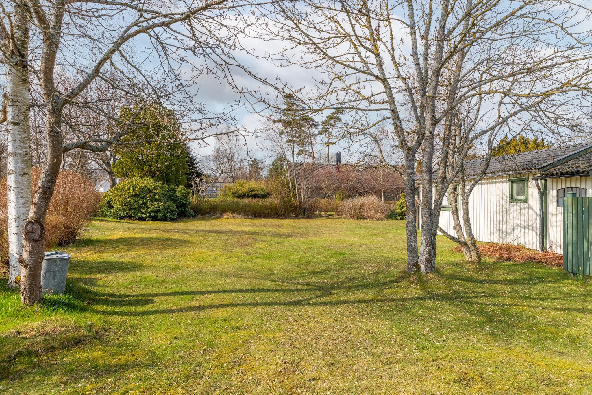 Ljuvlig hörntomt med stora gräsytor, björkar och rhododendron. Den stora tomten ger oändligt med möjligheter.