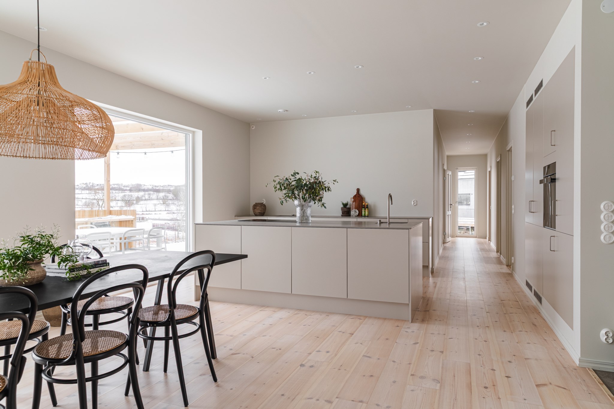Högt beläget i Grevie med utsikt över vidsträckt åkermark ligger detta nybyggda enplanshus på lugnt och nyetablerat kvarter. Huset har en träfasad behandlad med järnvitriol och invändigt väntar ett hem med skönt, mjukt flöde och generöst ljusinsläpp från stora fönsterpartier vända mot uteplatsen och öppna vyer. Pigmenterat furugolv löper genom bostaden och planlösningen är genomtänkt och tilltalande, med sina sociala ytor. Husets hjärta är sällskapsrummet i öppen planlösning mot köket, där sobra materialval och stilrena detaljer ger en känsla av vardagslyx. Vidare omfattar bostaden fem rum, varav fyra sovrum och erbjuder ett bekvämt boende i ett plan. Master bedroom har badrum en suite med dubbeldusch. Tvättstuga med groventré, isolerat förråd, laddbox till elbil och genomtänkt belysning fulländar detta hem med tydlig karaktär och självklar kvalitet. Här bor man i nybyggd och bekymmersfri bostad med naturen runt knuten, närhet till sandstrand och servicce i byn.