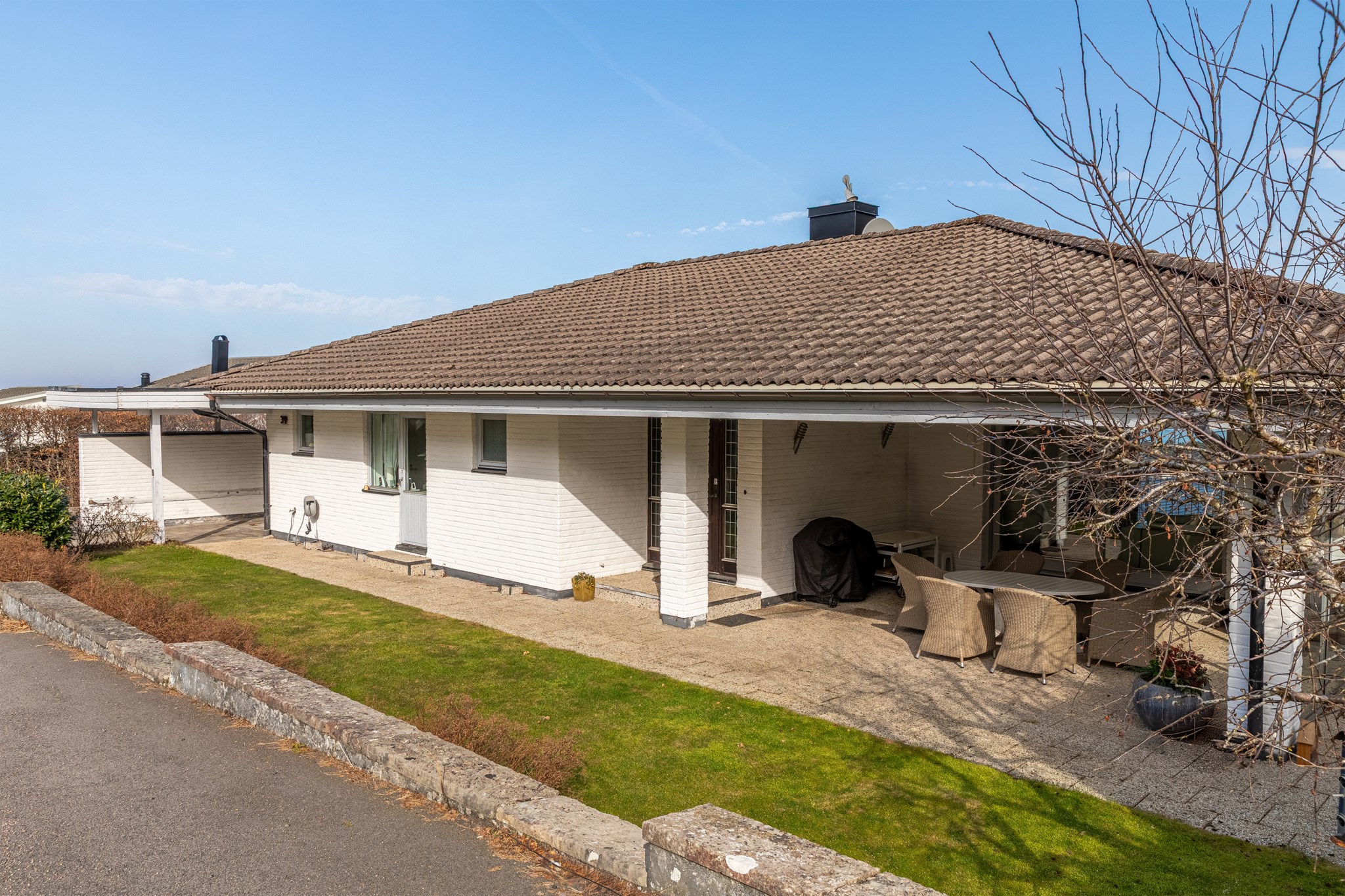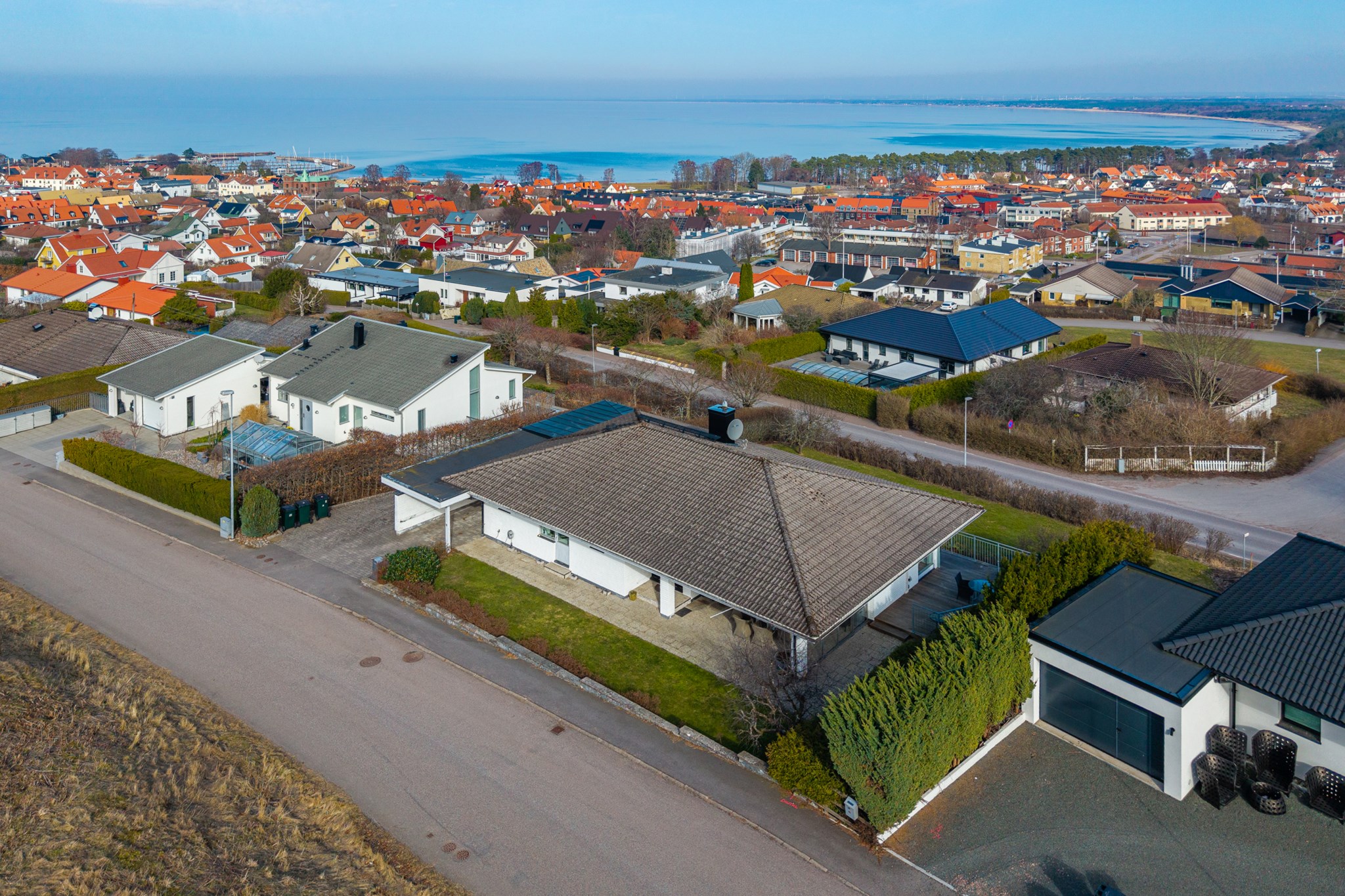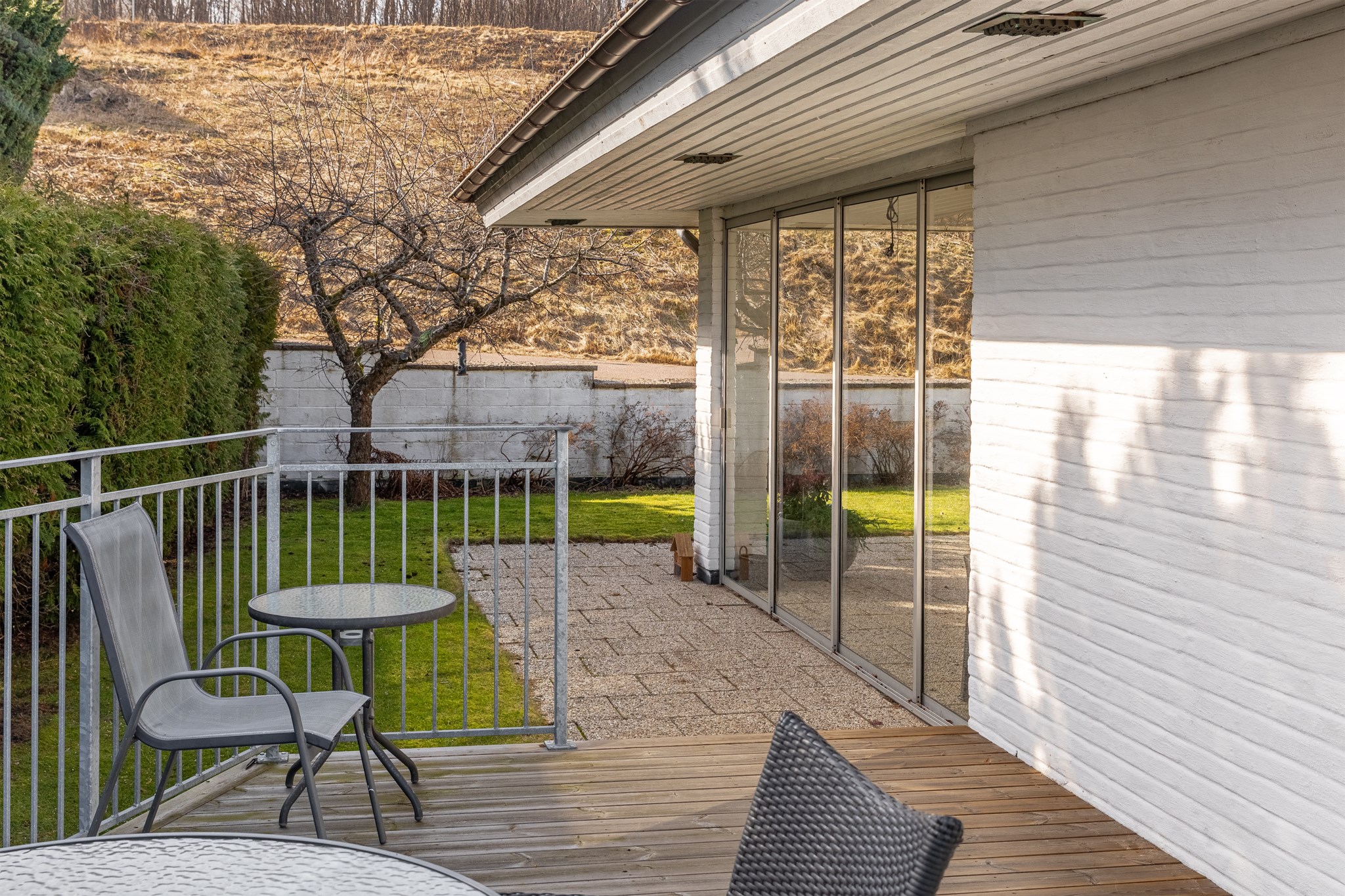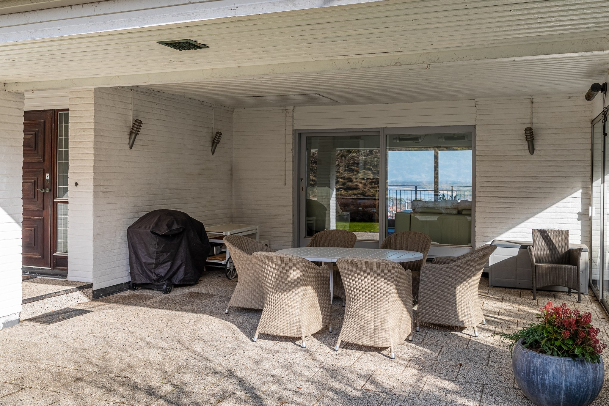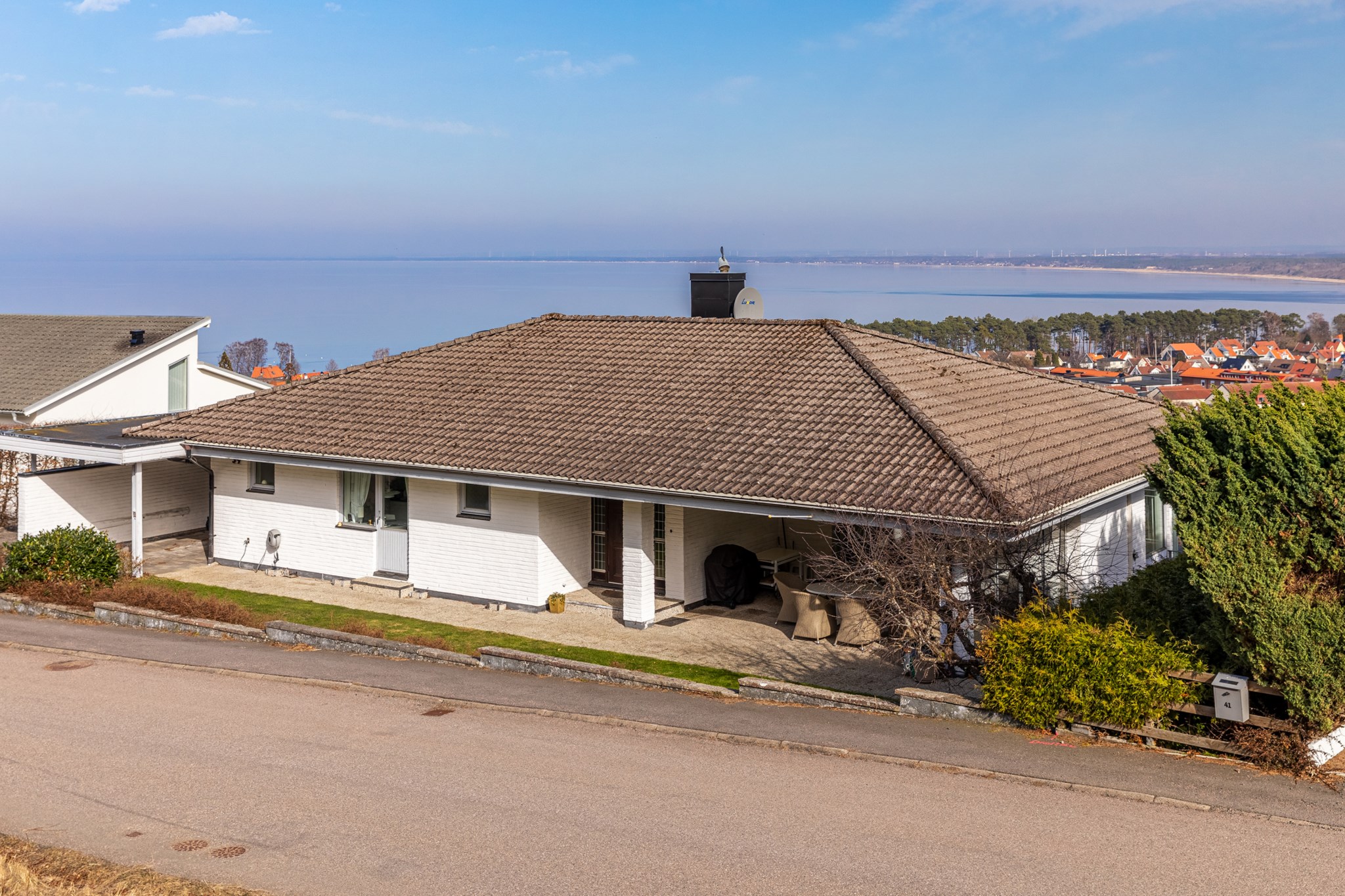 Inbyggt uterum med glaspartier mot öster och norr.BilplatsCarport för en bil samt ytterligare bilplatser på stensatt infart.TV- och internetanslutning