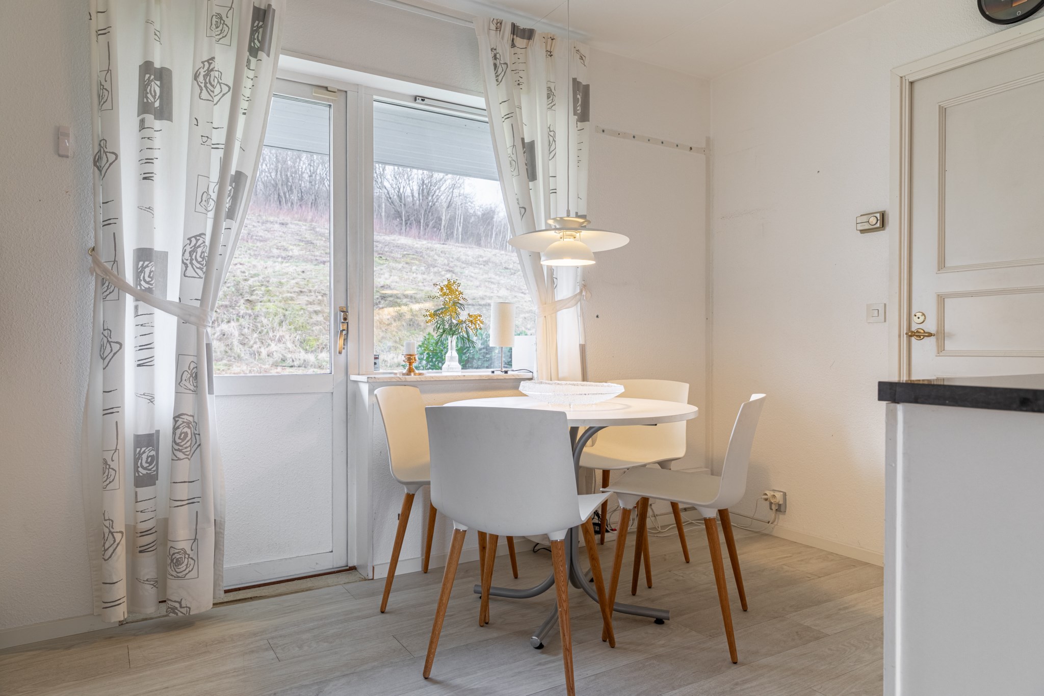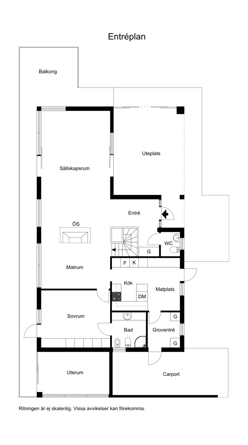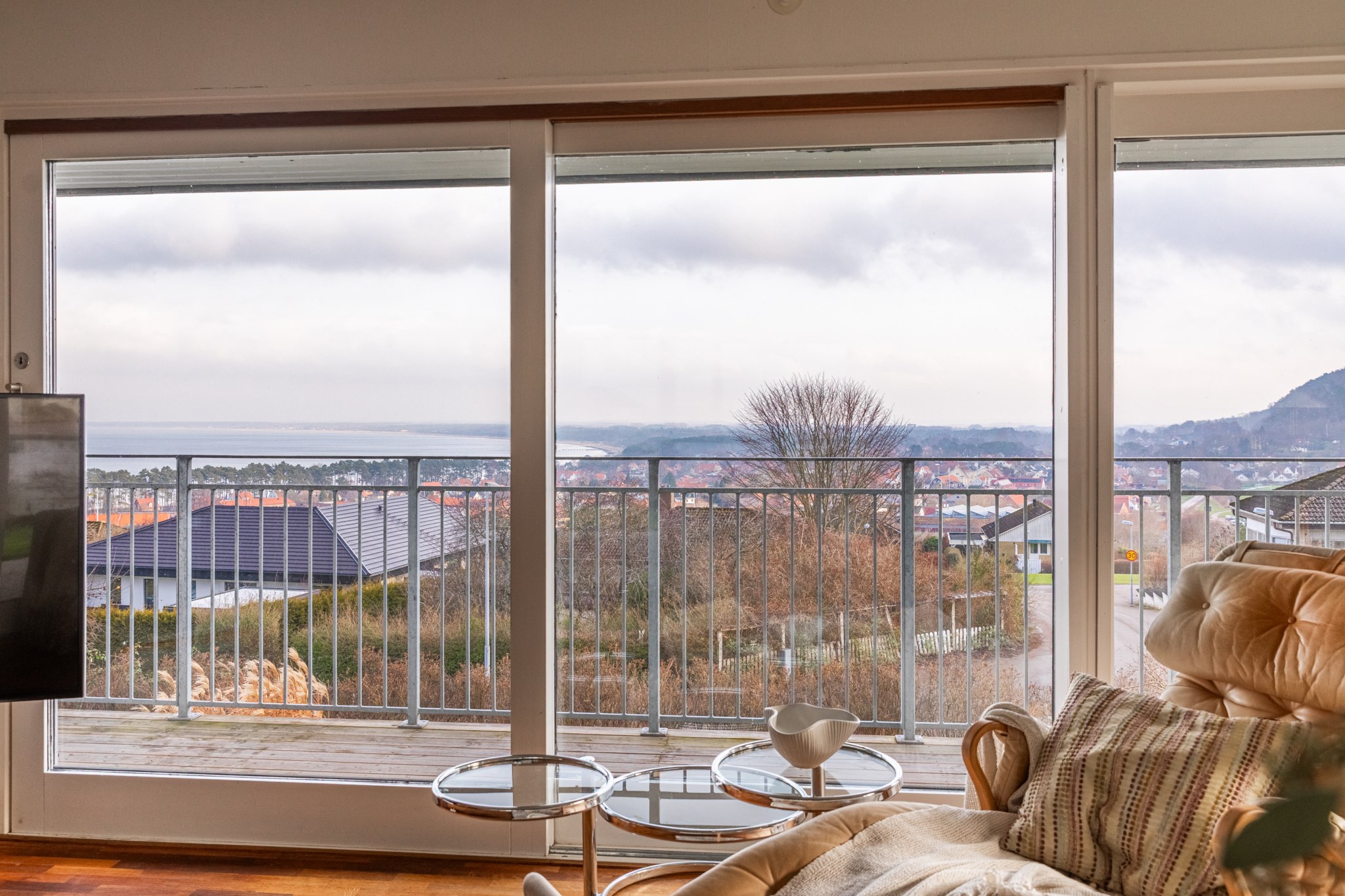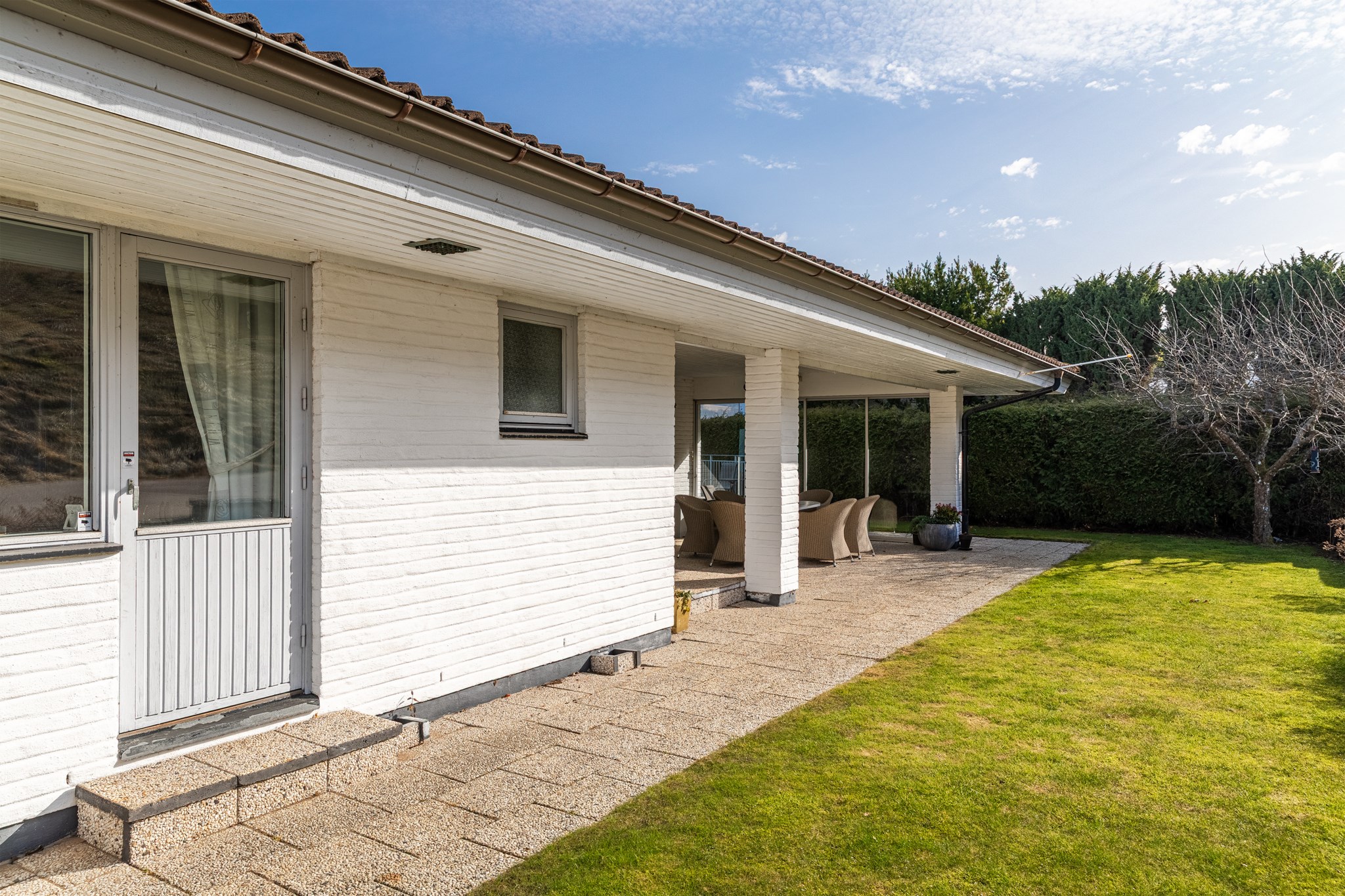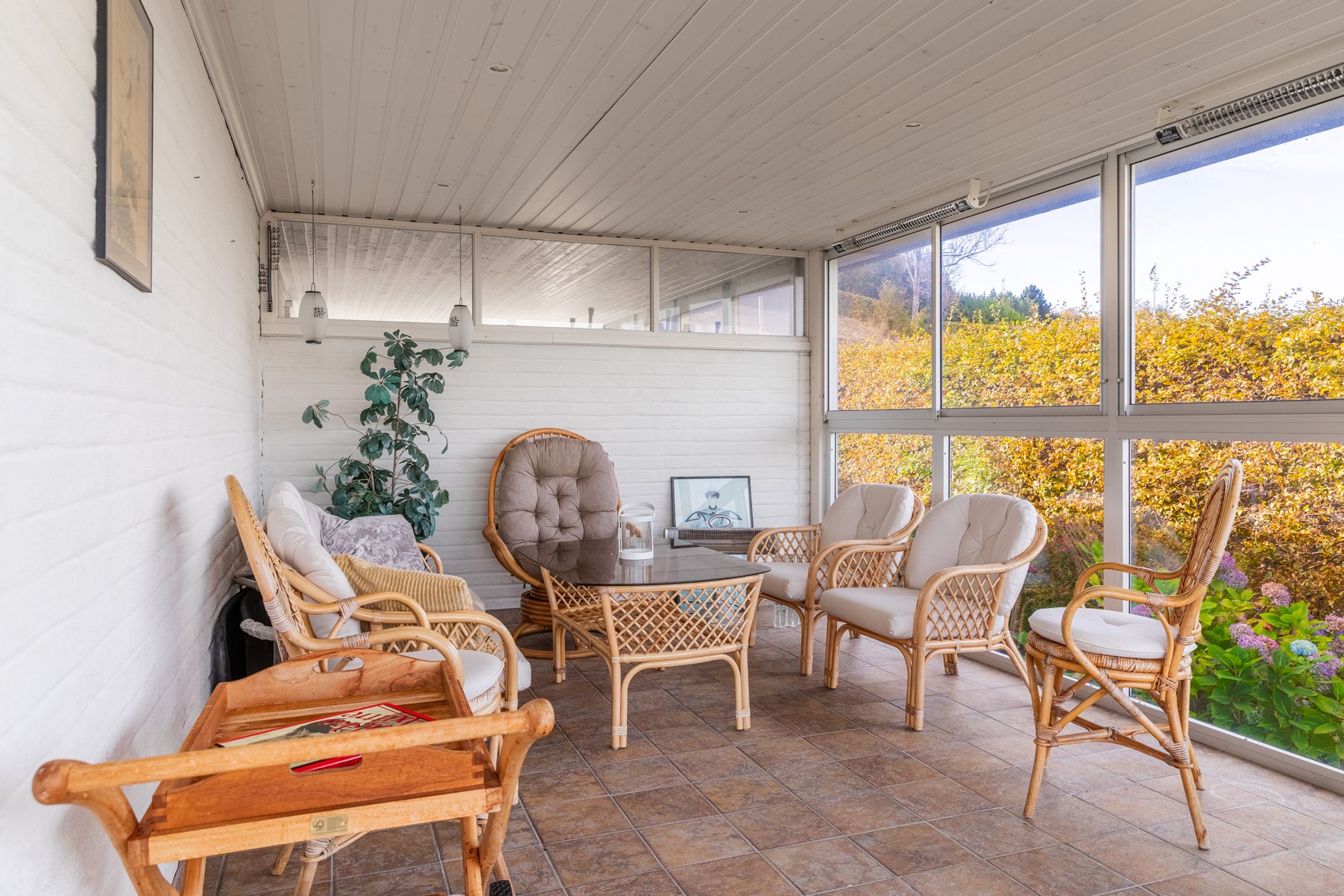 Inbyggt uterum med glaspartier mot öster och norr.BilplatsCarport för en bil samt ytterligare bilplatser på stensatt infart.TV- och internetanslutning
