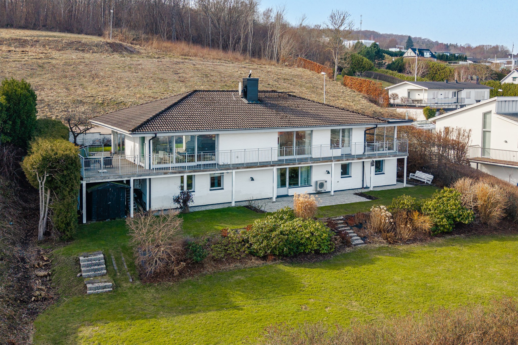 Med ett av Båstads mest eftertraktade toppläge säljs nu denna generösa och gedigna sluttningsvilla med vidunderlig utsikt över byn, havet, åsen och långt in över halländska slätten. Bo i bekväm och rymlig bostad, ritad av Stellan Paulie och uppförd av PEAB, med vackert ljus, öppen planlösning och skönt flöde mellan rummen samt förnämlig access till trädgård, balkong och uteplatser i alla väderstreck. De stora, ljusa sällskapsytorna, både uppe och nere, har centralt placerade eldstäder som skapar stämning året om. Vidare i bostaden finns matrum, kök och totalt 4 sovrum där master har badrum en suite. Avundsvärda utrymmen i souterrängplan såsom dusch/bastu/relax, förråd, tvättstuga samt mat-/vinkällare. Ute möts du av terrasserad och uppvuxen trädgård med gräsyta som är perfekt för dig med pooldrömmar. Carport och stensatt infart med plats för flera bilar kompletterar. Läget kombinerar lugn och avskildhet med närhet till byns utbud av strand, hamn, restauranger samt affärer, skola och service. Välkommen till detta boende som lämpar sig lika bra för åretruntliv som för den som söker ett storstilat sommarresidens.