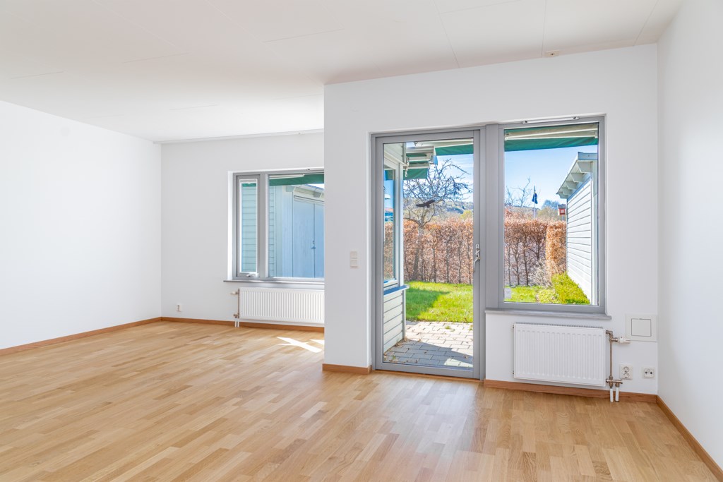 Inbjudande vardagsrum med utgång till trädgårdstäppan