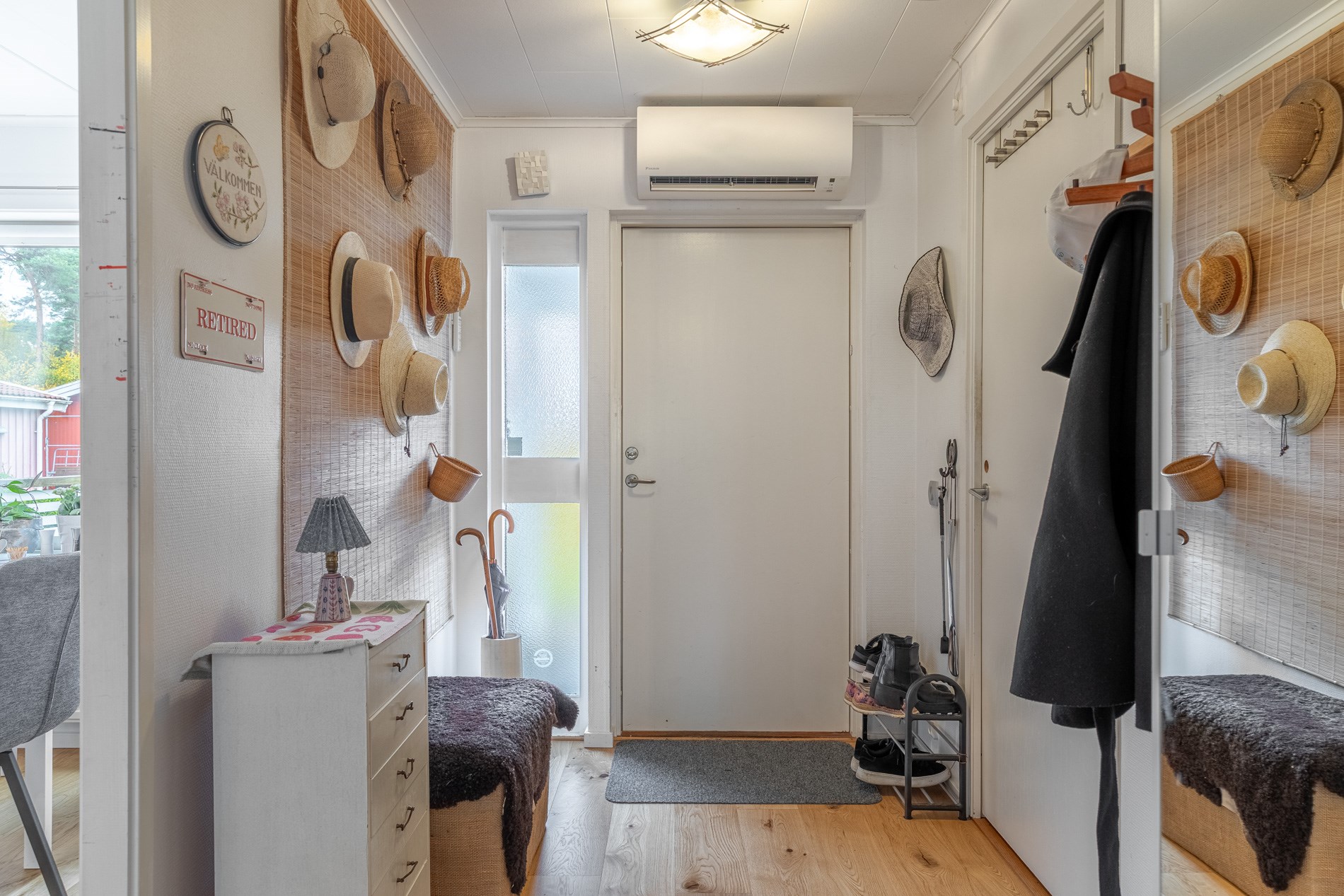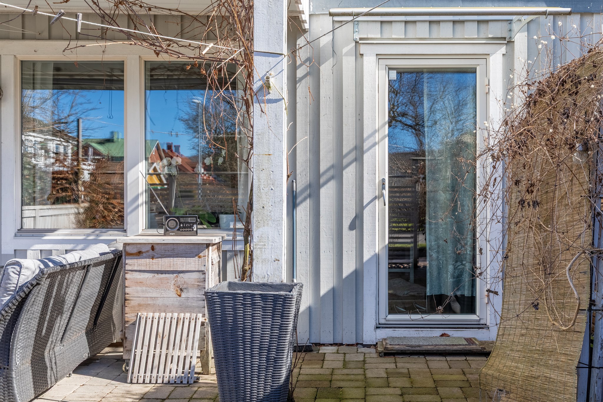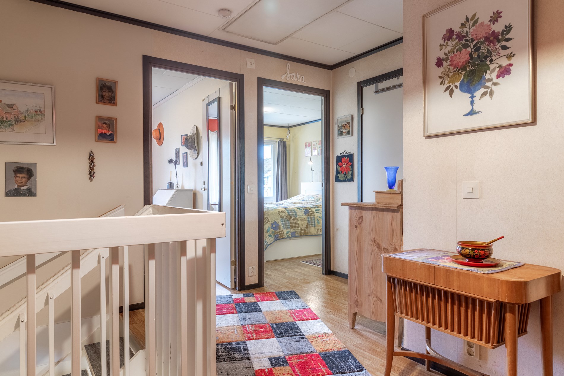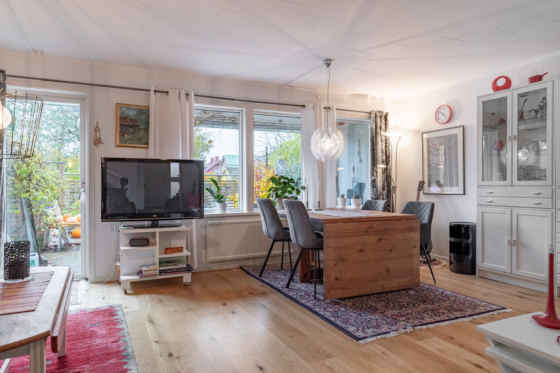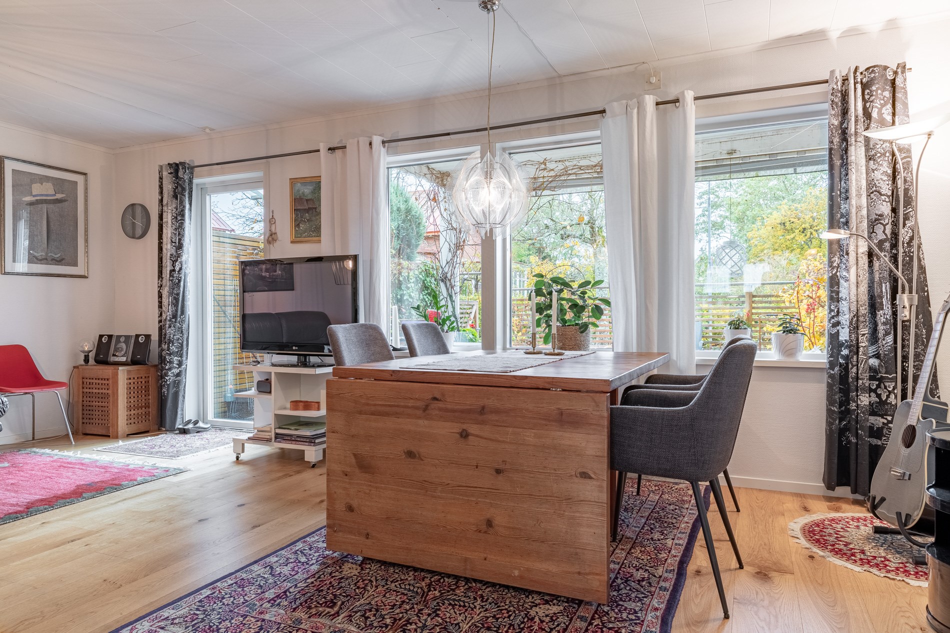 Byggnadstyp1 ½ planByggnadsår1984FasadTräStommeTräFönster3-glasfönsterBjälklagTräTakBetongpannorGrundBetongplattaUppvärmningLuft-luftvärmepump + oljefyllda elradiatorerVatten/avloppKommunalt vatten, Kommunalt avlopp.UteplatsEntrésidan vetter mot öster och välkomnar med morgonsol och stensatt uteplats mot den gemensamma innergården. På trädgårdssidan väntar insynsskyddad, lättskött och stensatt uteplats i soligt sydvästläge – delvis under tak – samt en balkong med markis i samma riktning.BilplatsCarport ingår i samfälligheten.Renovering2000 Badrum nere