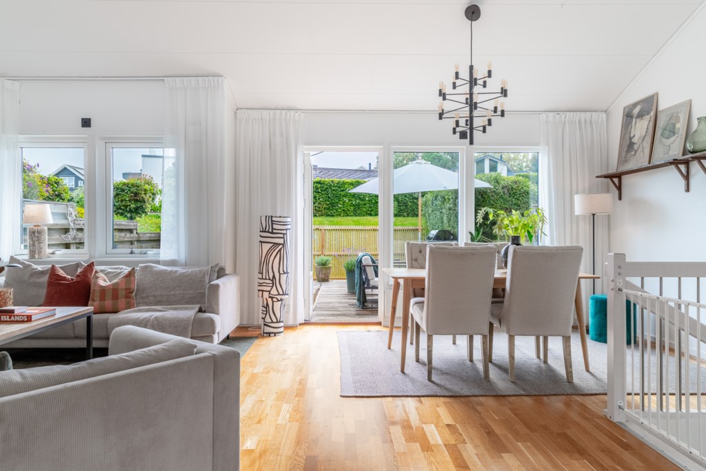 På mycket bra läge i området kan vi nu presentera denna smakfullt utformade och innehållsrika bostad i omtyckta Äppeldalen. Här erbjuds sociala utrymmen med spatiös takhöjd och fint ljusinsläpp, fullutrustat kök, två badrum, separat tvättstuga, tre bra sovrum samt stor walk in-closet. Från ovanvåningen, som ligger i souterräng, har man utgång både till den insynsskyddade trädgården med uteplats på baksidan samt överbyggd balkong med havsutsikt på framsidan. Uppfarten är stensatt och erbjuder carport, parkeringsplats och förråd. Här bor man på lugnt och tryggt läge, men ändå med närhet till service, kommunikationer och restaurangliv inne i byn. En genomtänkt och lättskött bostad som ger dig tid att kunna njuta mer av vardagen!
