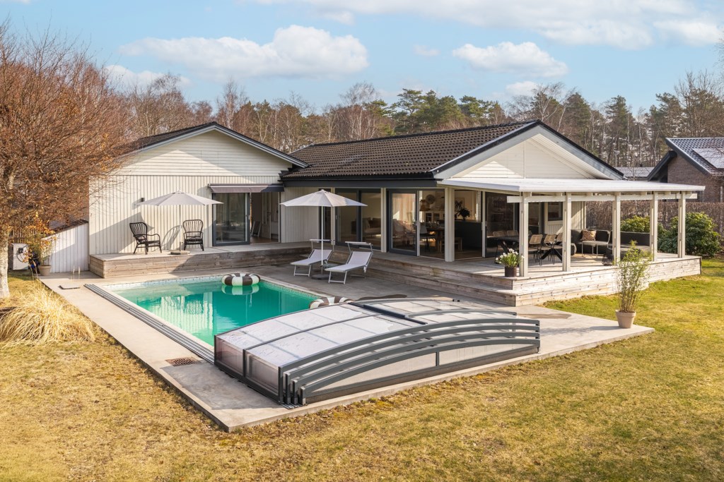 I detta bekväma och lättillgängliga sommarnöje i Hemmeslövs omtyckta strandkvarter är det lätt att leva. Den tilltalande bostaden är generös och erbjuder öppna ytor där gränsen mellan ute och inne suddas ut på ett enkelt sätt via flertalet glasade skjutpartier mot poolområde och terrasser. 4 sovrum och 2 badrum erbjuder plats för många.
